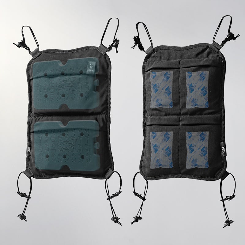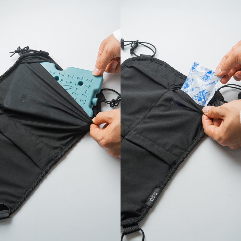 表面には-11℃の保冷効果を発揮するキャンプ用保冷剤「フツーノアイスM」が2個、裏面には「小さな保冷剤」を4個収納できるマルチポケット仕様。「キャンプ用の強力な保冷剤はあるが、平日に使う機会がない」「冷凍庫に保冷剤が余っている」という家庭あるあるを逆手に取った経済的な仕様です。その日の気温や服装に合わせて、冷却具合や重量を調整することができます。