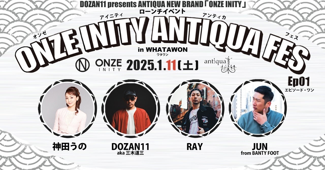 株式会社antiqua(本社:大阪府和泉市)とレゲエアーティストDOZAN11(aka 三木道三)のコラボレーションブランド「ONZE INITY(オンゼアイ二ティ)」のローンチイベントを2025年1月11日(土)大阪府岸和田の滞在型エンターテインメントモール「WHATAWON(ワタワン)」で実施いたします。
