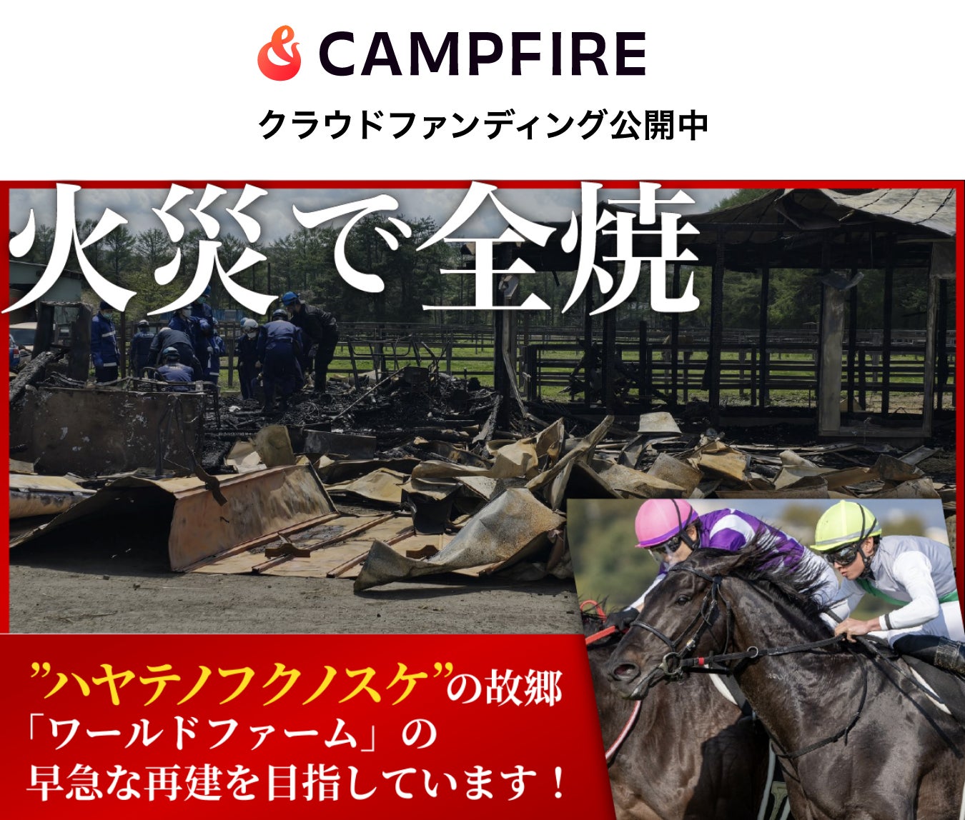 株式会社ファーストイノベーション(本社:東京都中央区、代表取締役社長:木ノ根雄志、以下ファーストイノベーション)は、無償制作支援を行った青森県階上町の競走馬牧場「ワールドファーム」再建クラウドファンディングを、2025年5月29日にスタートし、公開からわずか1時間で支援金額が100万円を突破したことをお知らせいたします。