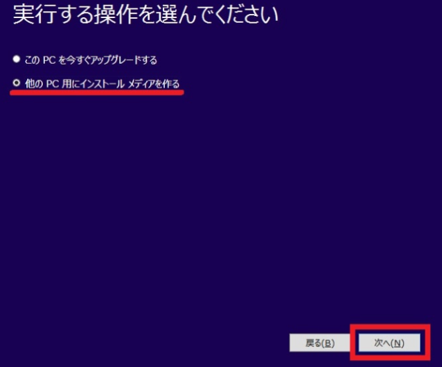 Step3:ライセンス条項に同意して「他のPC用にインストールメディアを作る」を選んで「次へ」をクリックします。