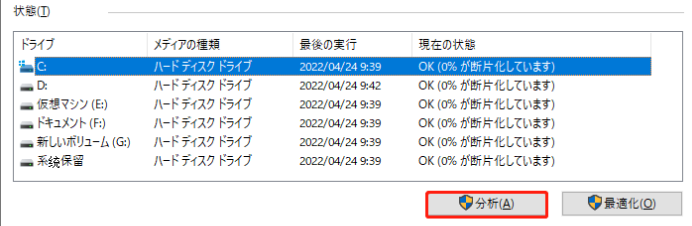 Step2:「分析」をクリックするとディスクを最適化するべきかの分析が始まります。ドライブの断片化が10%以上であれば最適化できます。