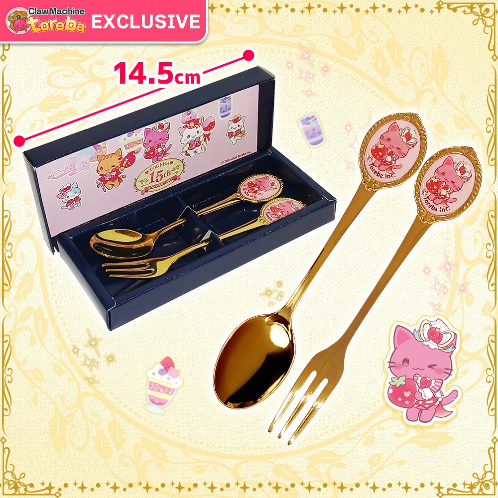 ゴールドに輝くスプーンとフォークの持ち手には、イチゴを抱えたキュートな「トレタ」がデザインされています。
