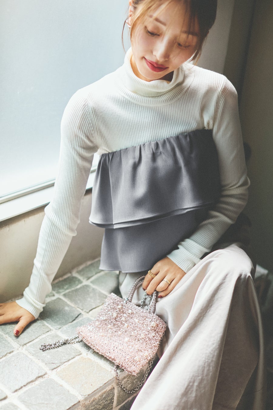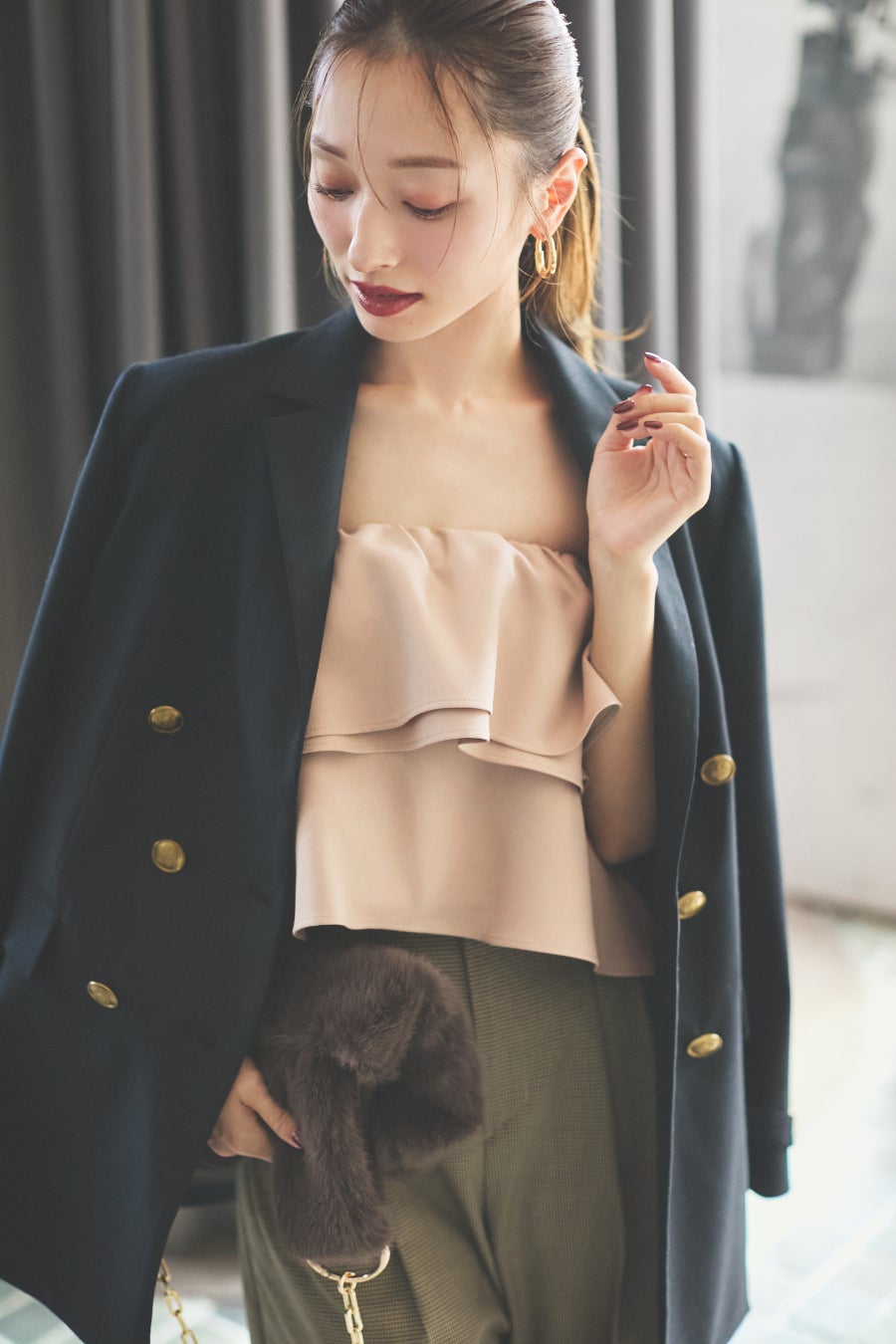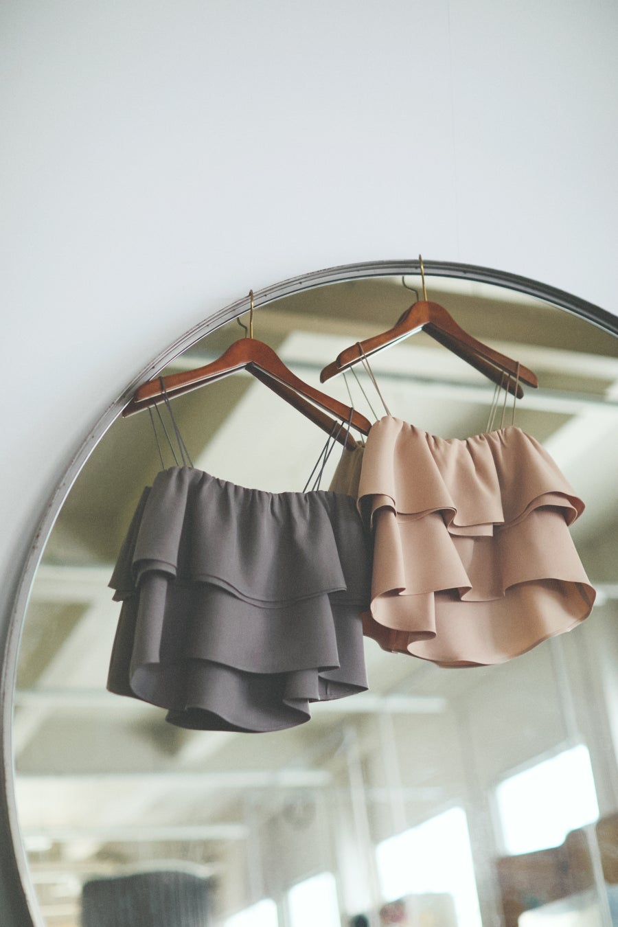 トレンドのビスチェを大人が着こなせるよう、華やかなラッフルデザインで上品に仕上げました。後ろ下がりのシルエットが腰回りをカバーし、スタイルアップと体型カバーを両立します。内側には滑り止めテープを施し、締め付け感なく快適に着用いただけます。