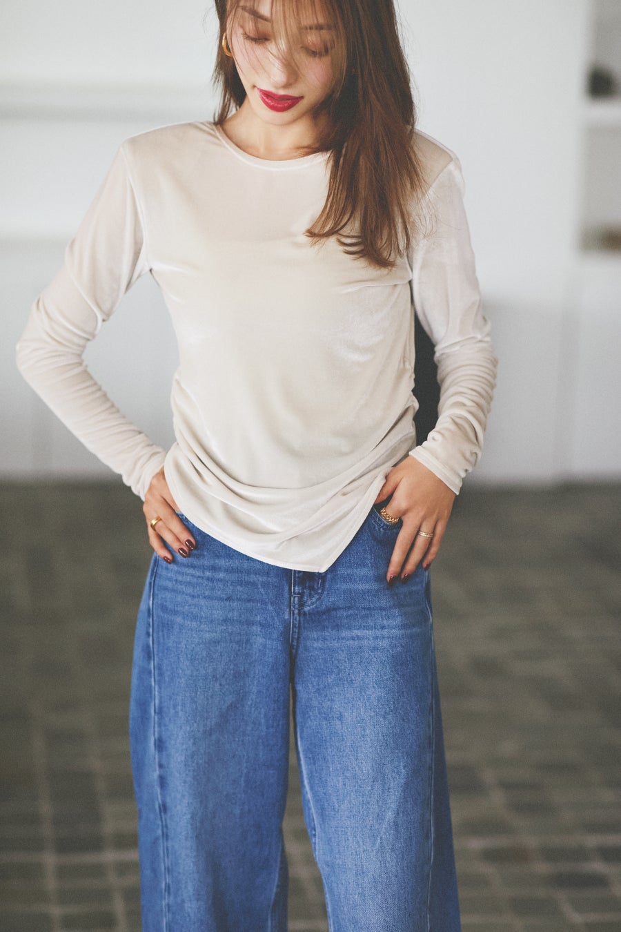 デコルテラインを美しく見せる、薄手ショルダーパッド入りのベロアカットソープルオーバー。華奢感と小顔効果を叶えます。背中の開きは下着が見えないよう調整されており、インでもアウトでも着回し力抜群の一枚です。