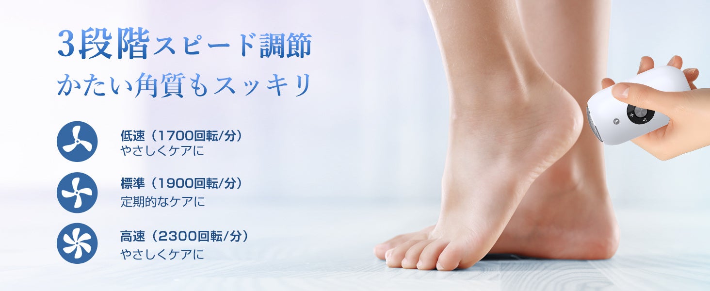 3段階(低速1600rpm・標準1900rpm・高速2300rpm)のスピード調整が可能で、部位や角質の状態に合わせて最適なケアを行えます。