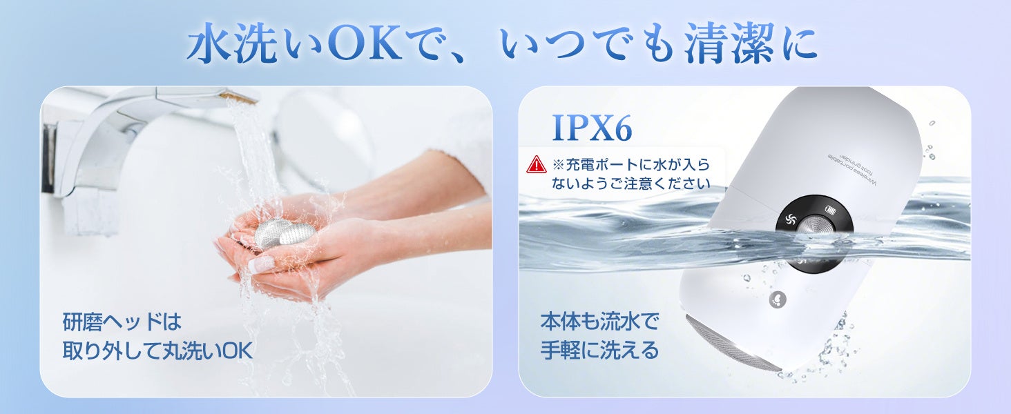 IPX6防水仕様で、お手入れは研磨ヘッドを外してサッと水洗いするだけ。