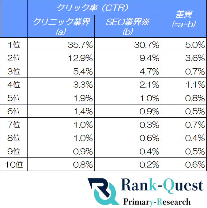 さらに、SEO業界のデータと比較すると、どの順位においてもクリック率が上回っており、クリニック関連の検索では幅広い順位で情報が確認されていることがわかります。特定の順位だけに偏るのではなく、上位から下位まで一定の関心が向けられている点は、この領域ならではの特徴といえます。