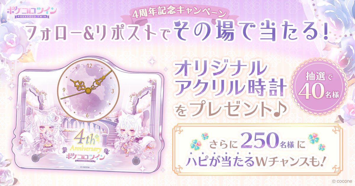 『ポケコロツイン』公式Xをフォロー&対象ポストをリポストされた方の中から抽選で40名様に、「オリジナルアクリル時計」が当たるキャンペーンを開催します。さらに、キャンペーン参加者の中から抽選で250名様に「444ハピ(アプリ内通貨)」が当たるWチャンスも実施します。