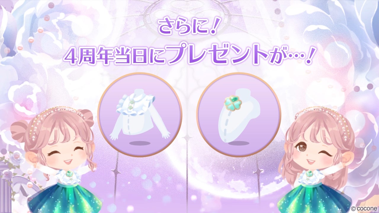 4周年を記念した福袋(着せかえアイテム)が、7日間の期間限定で販売します。今回は、可愛らしくも幻想的な“ふわふわ白猫”がテーマ。おしゃまな子猫のなき声をイメージした、声を着せかえられるアイテムも登場します。