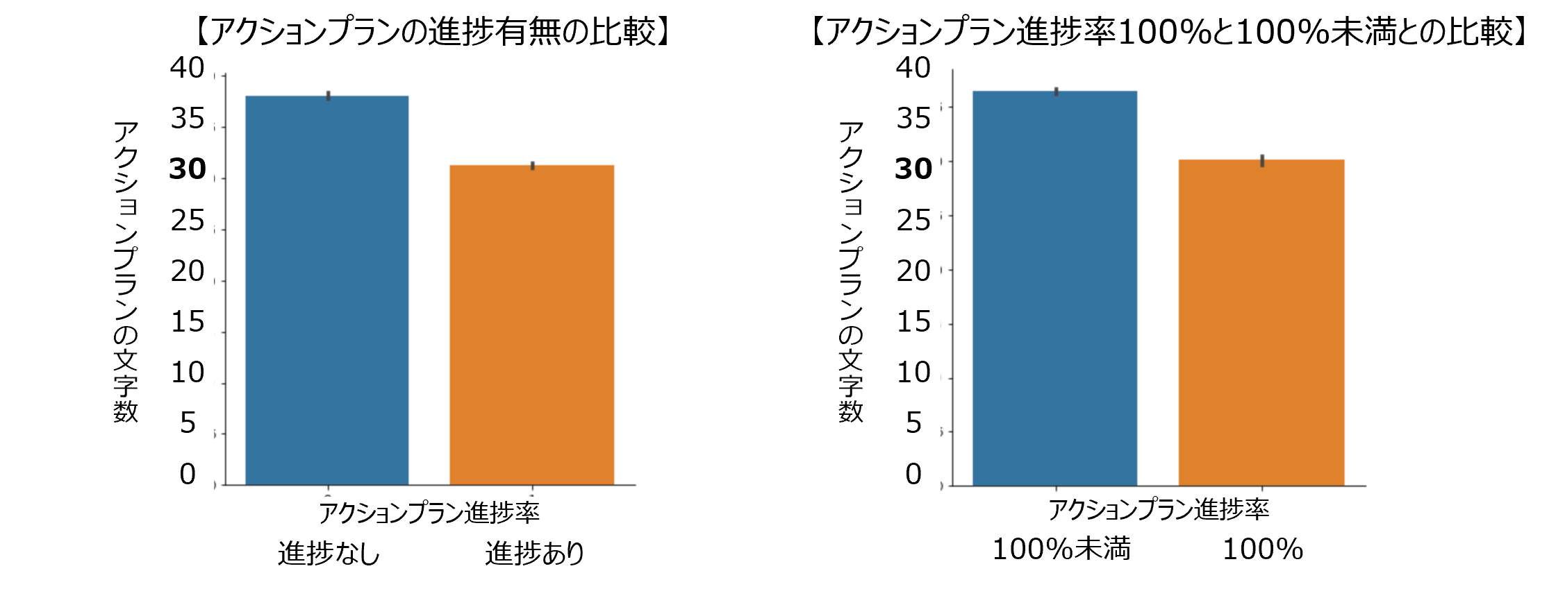 下図の通り、アクションプランが進捗している組織、及び、アクションプランの進捗率が100%の組織ほど、アクションプランの平均文字数が「30文字」程度と端的であることがわかった。