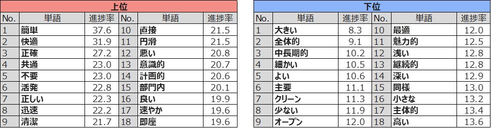 【2】アクションプランの進捗率が上位の単語は行動を形容するもの、下位は状態を形容するものが多い