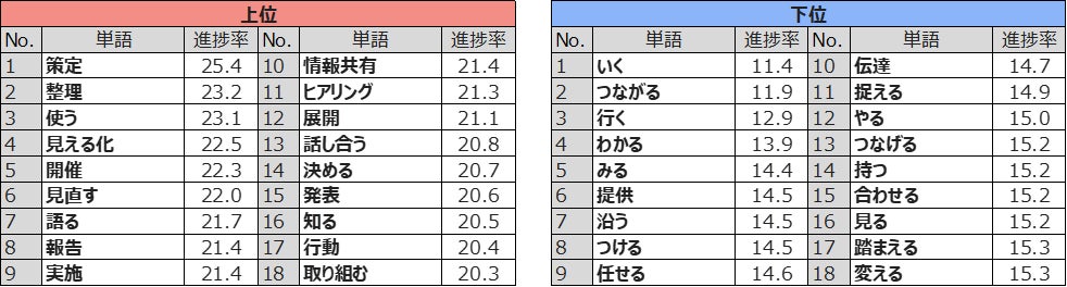 【1】アクションプランの進捗率が上位の単語は行動が明確なもの、下位は曖昧なものが多い