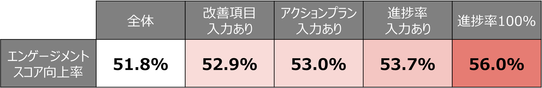 このことから、アクションプランを進捗させ、持続している組織ほど、エンゲージメントスコアは向上していると言える。