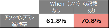 このことから、期限やスケジュールが明確であると、アクションプランの進捗率が高いと言える。