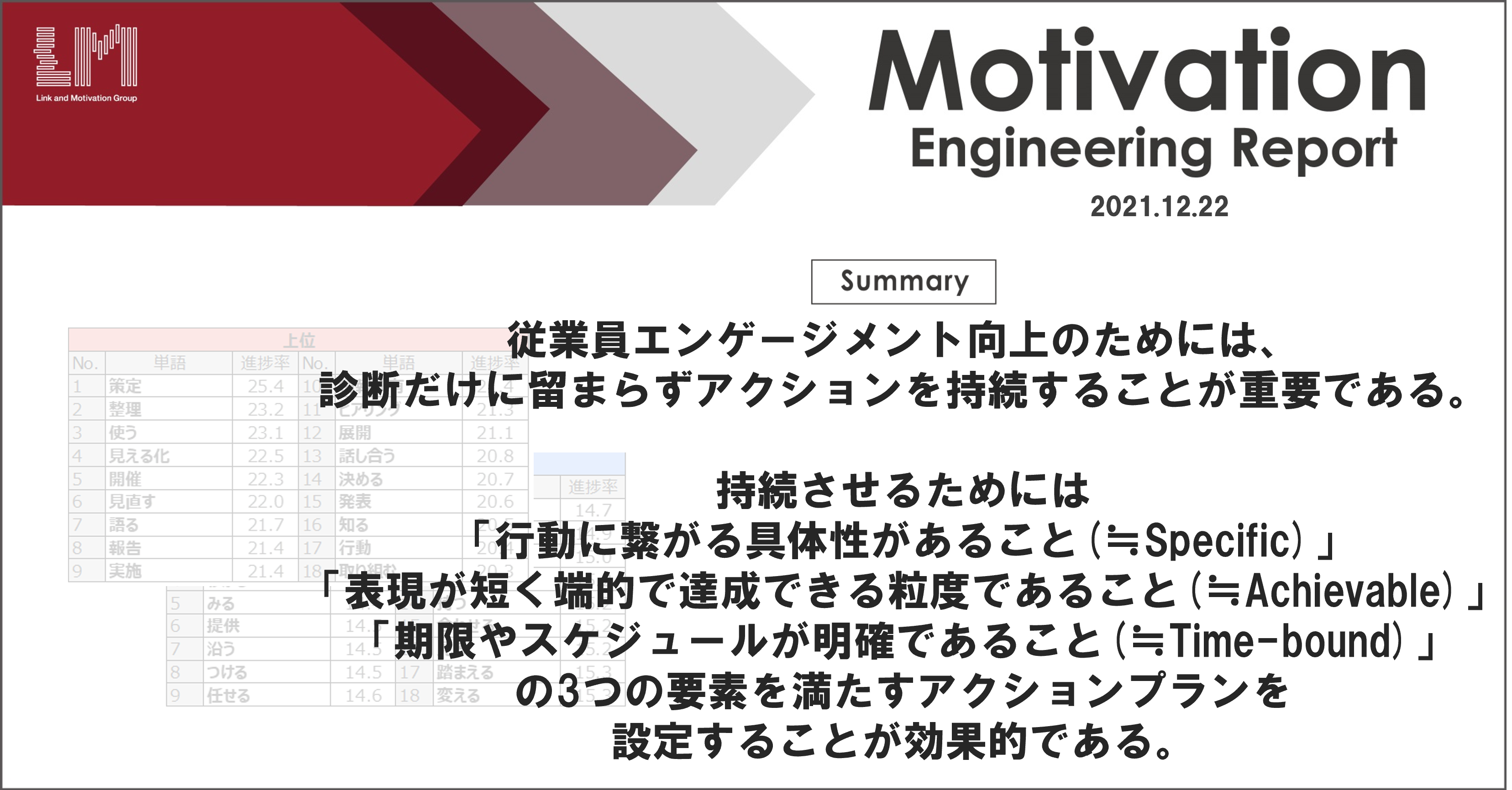 株式会社リンクアンドモチベーション(本社:東京都中央区、代表:小笹芳央、証券コード:2170、以下当社)の研究機関モチベーションエンジニアリング研究所(以下当研究所)は、「従業員エンゲージメント向上のための効果的なアクションプラン」に関する調査を行いましたので、結果を報告いたします。