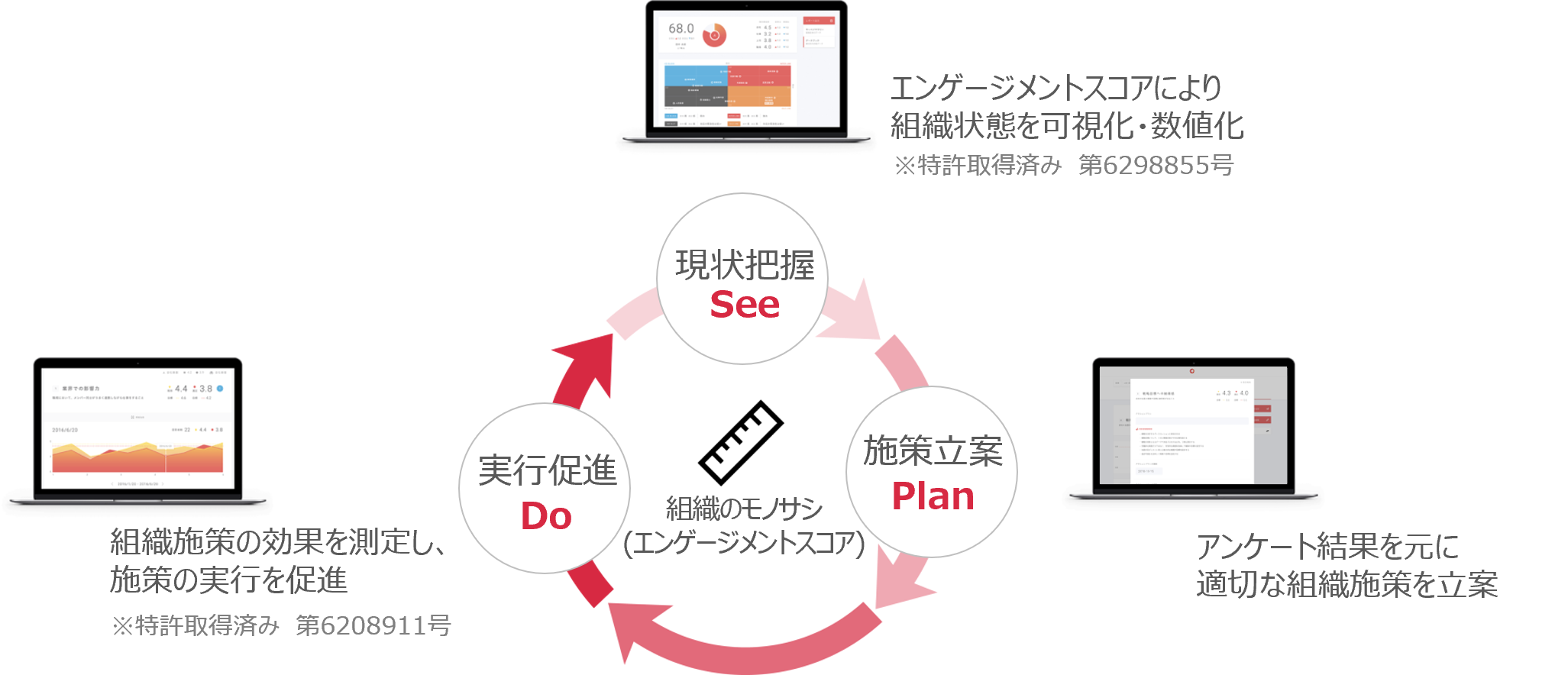 『モチベーションクラウド』とは、㈱リンクアンドモチベーションが2016年にリリースした、組織改善のクラウドサービスである。国内最大級のデータベースをもとに、組織状態を可視化し、PDSサイクルを促進するアクションプラットフォームを構成する。本調査では、従業員エンゲージメントの向上のために「どのようなアクションプランが効果的であったか」の要素を抽出するべく、リリースから現在に至るまで、モチベーションクラウドに登録されている全てのアクションプランデータを元に、分析を実施した。
