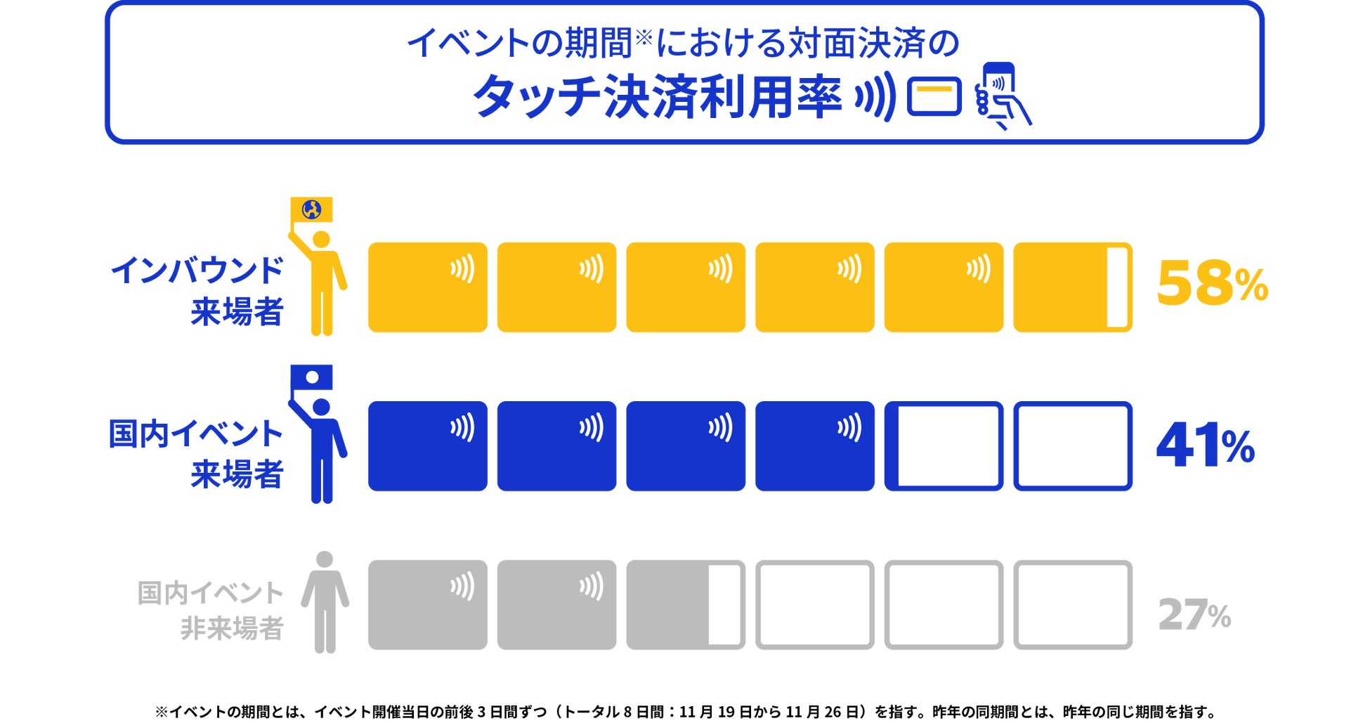 データからは、Visaのタッチ決済による取引の普及についての興味深い結果も見えてきました。イベント来場者は、イベント非来場者に比べて、イベントの期間*2、対面決済においてVisaのタッチ決済を利用した割合が多いことがわかりました。国内イベント非来場者が27%の利用に対して、国内イベント来場者の場合は、41%と大きな差が見られました。さらに、インバウンド来場者の場合は、対面決済の約6割(58%)がタッチ決済で行われていることがわかりました。約200の国と地域で利用でき、全世界のVisaの対面決済のうち、70%以上*3がタッチ決済で行われている中、自国で当たり前の決済手段となっている、便利で安心・スピーディな決済方法を自国以外でも利用することで、よりスムーズな決済体験を利用する人が多いことがうかがえます。