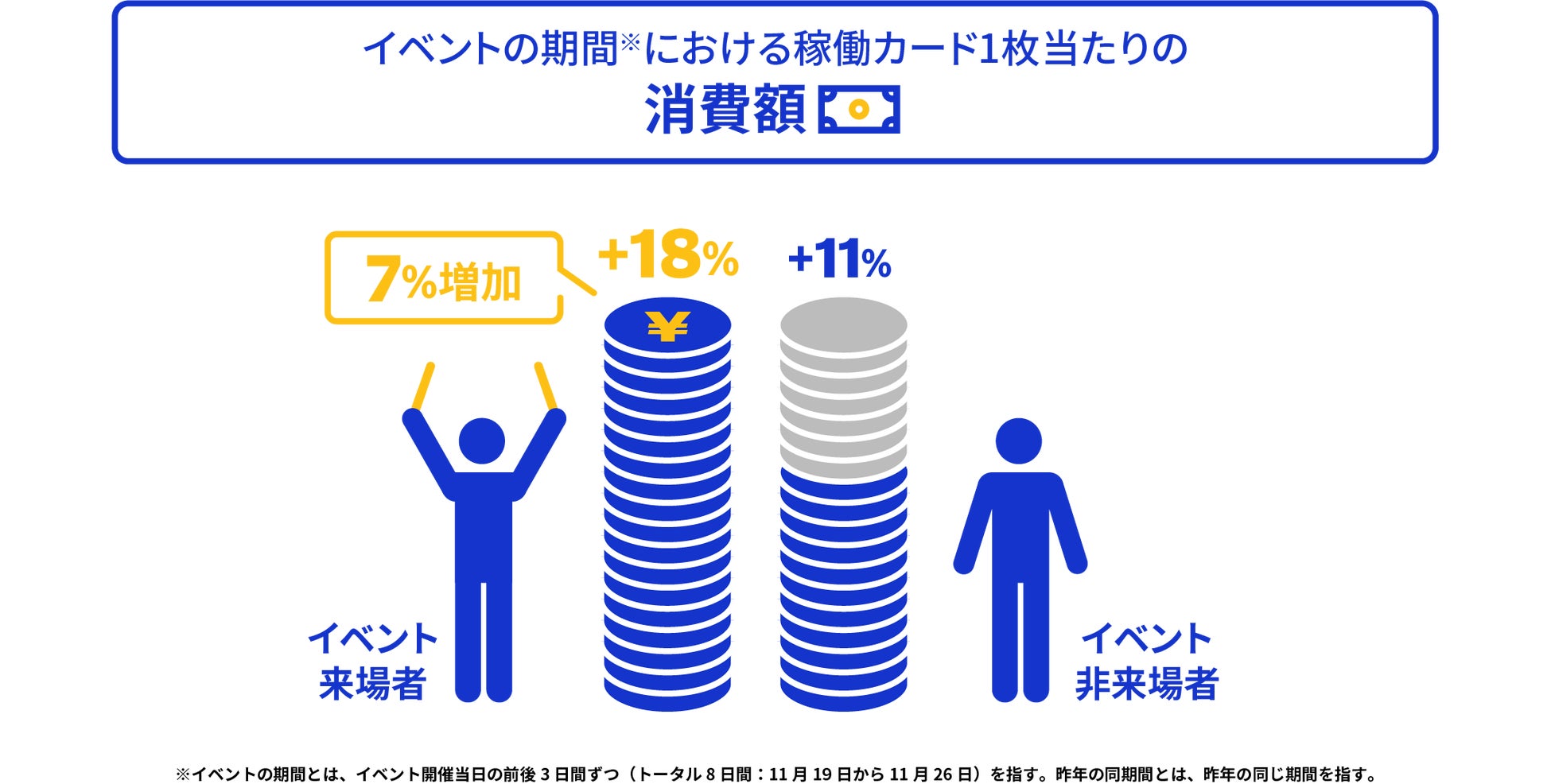 イベントの経済的な効果も明らかになりました。イベントの期間*2の稼働カード1枚当たりの消費額は、昨年の同期間と比べ、18%増でした。全体的な平均消費額の増加率(自然増)は11%で、この差である7%消費増は、イベントによる消費効果とみられます。