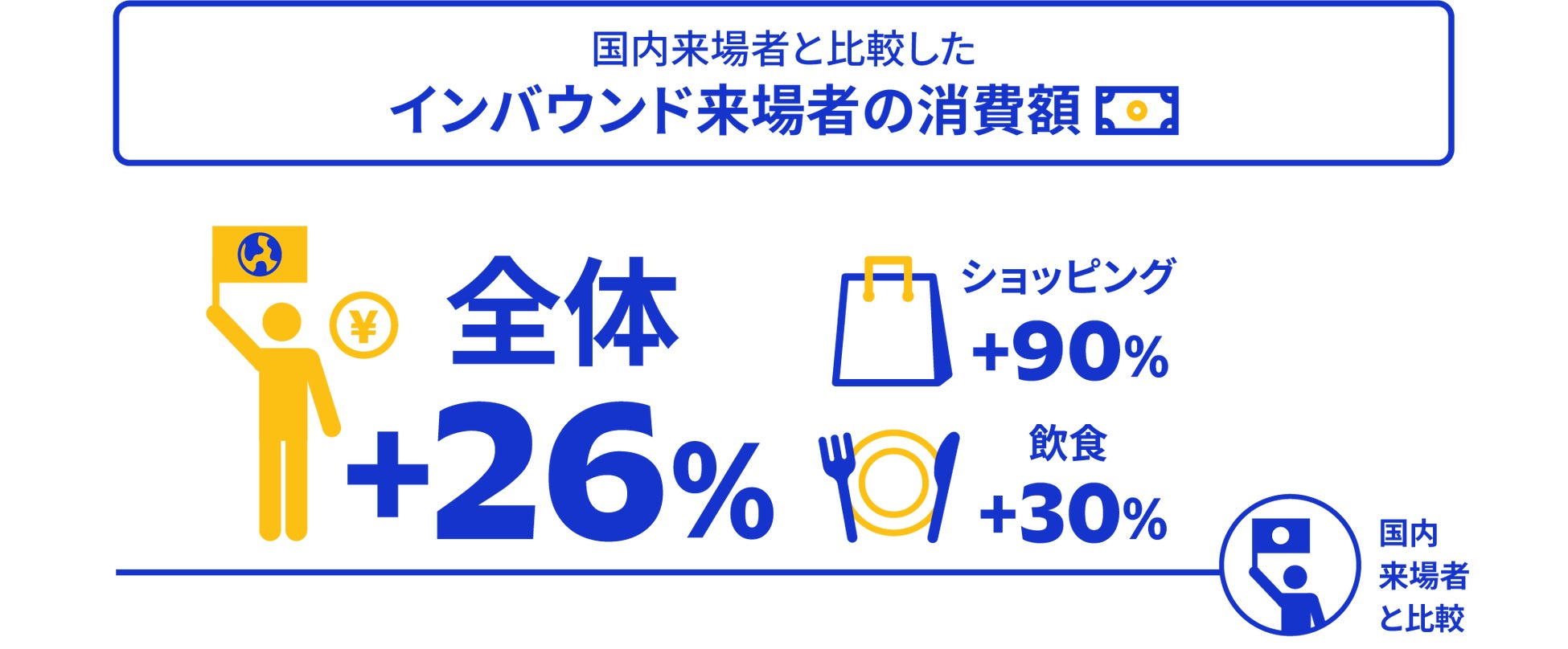 インバウンド来場者についてみてみると、イベントの期間*2、国内イベント来場者よりも稼働カード1枚あたりの消費額が26%多いことがわかりました。特にショッピングと飲食においては顕著な差が見られました。ショッピングにおいてはインバウンド来場者が国内イベント来場者に比べて、90%多く消費しており、飲食においては、30%と、イベントに来場するのみだけでなく、滞在を楽しみながら、より高額の消費をしていることが明らかになりました。
