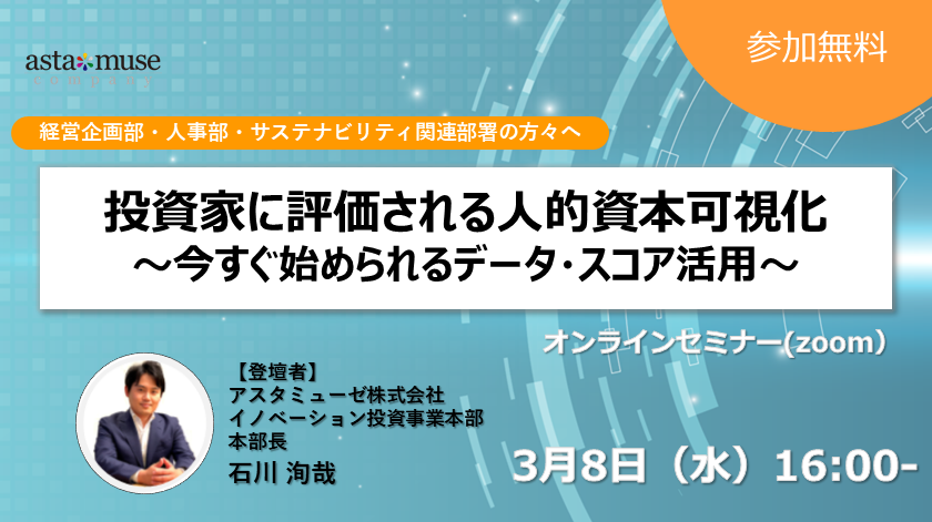 「投資家に評価される人的資本可視化~今すぐ始められるデータ・スコア活用~」無料ウェビナー開催!3月8日16時~