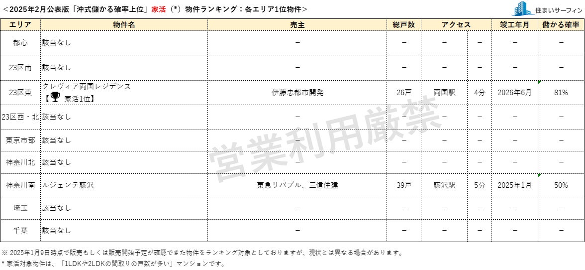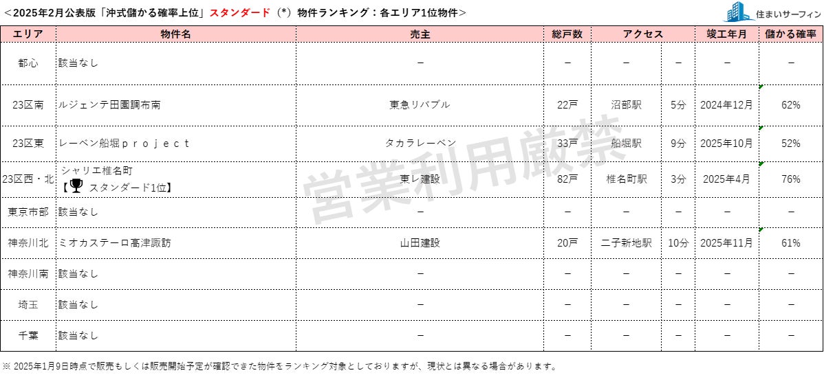 昨今のマンション価格の高騰を受け、購入検討時に資産性を重視する消費者の割合が高まりつつあります。このような社会動向と消費者ニーズをふまえ、「住まいサーフィン」では資産性を重視したマンション選びの支援を目的に、首都圏のマンションを「沖式儲かる確率」の高い順にランキング化し、毎月発表しています。対象物件は、首都圏で販売中および販売予定のマンションで、本リリースでは9エリアにおける“スタンダード(*)”物件と“家活(*)”物件それぞれ1位の物件のみを公表しています。