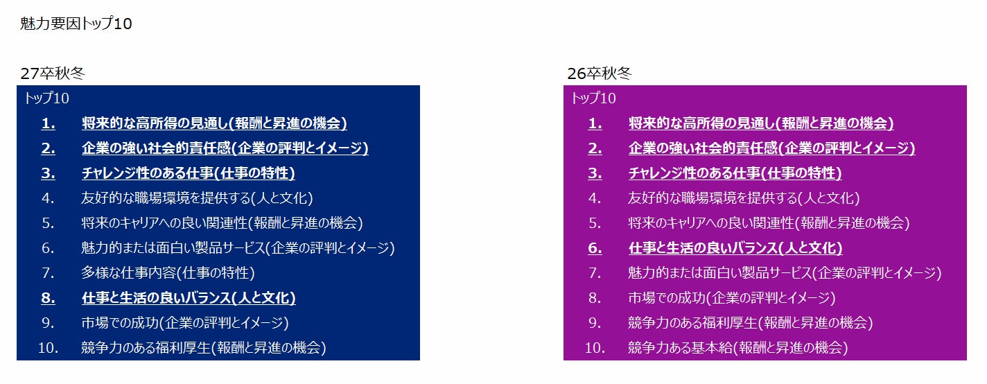 学生が企業を選ぶ際に重視する項目について、1位「将来的な高所得の見通し」2位「企業の強い社会的責任感」3位「チャレンジ性のある仕事」は順位に変化なし。