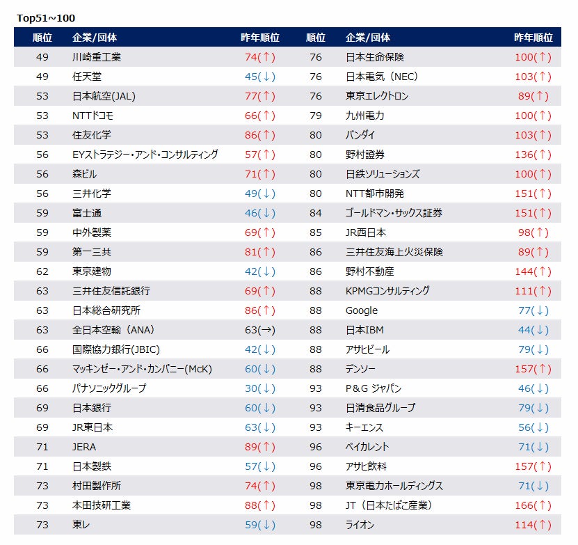 ランキング上位には、不動産の三井不動産(6位)、食品のサントリーホールディングス(7位)、銀行の三菱UFJ銀行(9位)、コンサル・シンクタンクの野村総合研究所(10位)、運輸のJR東海(10位)、電子・電気機器のソニーグループ(14位)、輸送用機器のトヨタ自動車(21位)、電力の関西電力(24位)、損害保険の東京海上日動火災保険(28位)、広告の電通(29位)など、50業界中18業界のNo.1企業がTOP30位以内に名を連ねています。