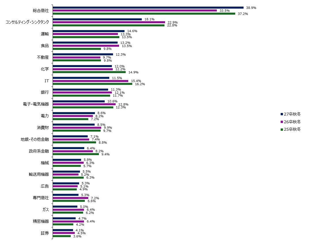 一方で、かつて上位を独占したコンサルティング業界の得票シェアは25卒22.8%→26卒22.9%→27卒18.1%で推移。高止まりの状態から低下へ転じました。アクセンチュア(14位→42位)、PwCコンサルティング(18位→29位)、デロイト トーマツ コンサルティング(23位→40位)、ボストン コンサルティング グループ(27位→32位)、アビームコンサルティング(37位→47位)、マッキンゼー・アンド・カンパニー(60位→66位)。
