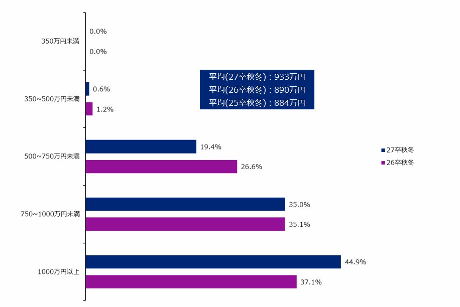 30歳時点の希望年収は平均933万円(前年890万円、前々年度884万円から大幅増)