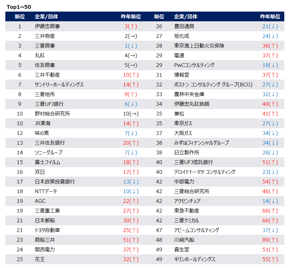 1位の伊藤忠商事を筆頭に、学生の「高い報酬」と「グローバルな活躍」等への欲求を一身に引き受ける結果となりました。