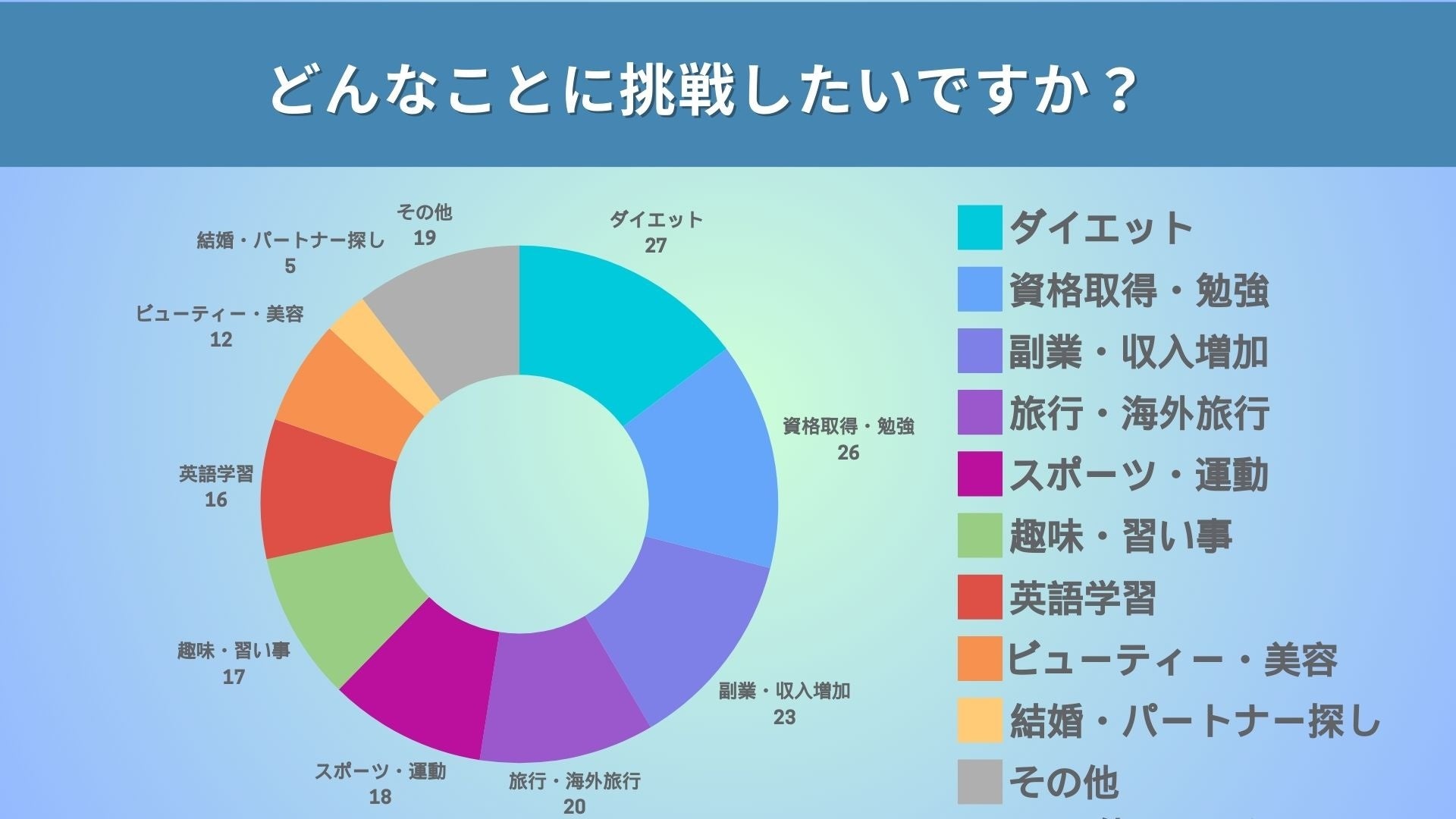 特に多かったのはダイエットや資格取得・勉強、副業・収入増加、旅行・海外旅行などです。多くの人が自己成長やライフスタイルの向上に挑戦したいと考えている傾向があります。