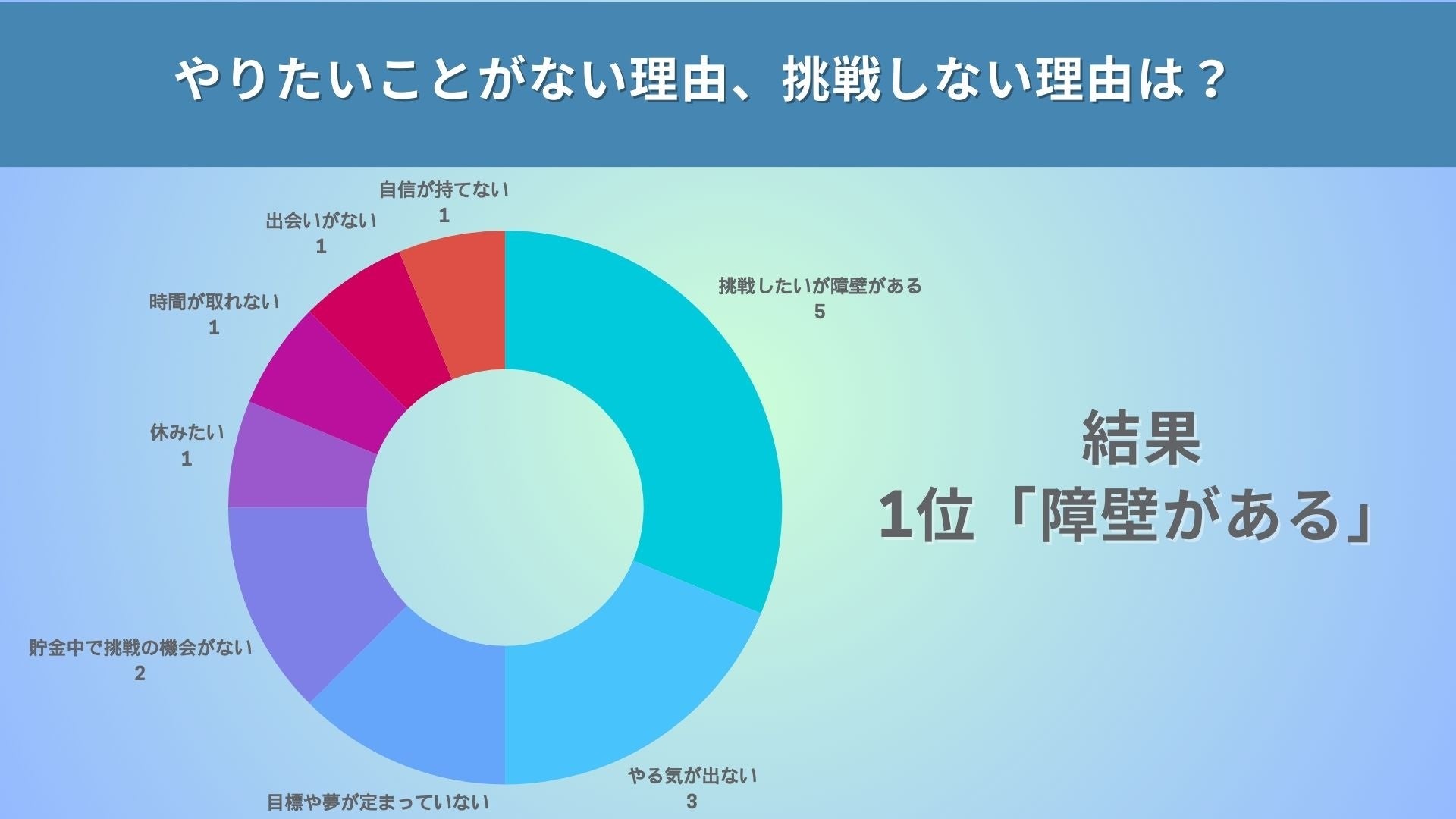 何らかの障壁があり挑戦できない、やる気が出ない、目標が決まっていない。という精神的な問題の割合が多いという結果になっています。また、貯金がない、時間が取れないなどの物理的な障壁により挑戦できない方もいることが分かりました。
