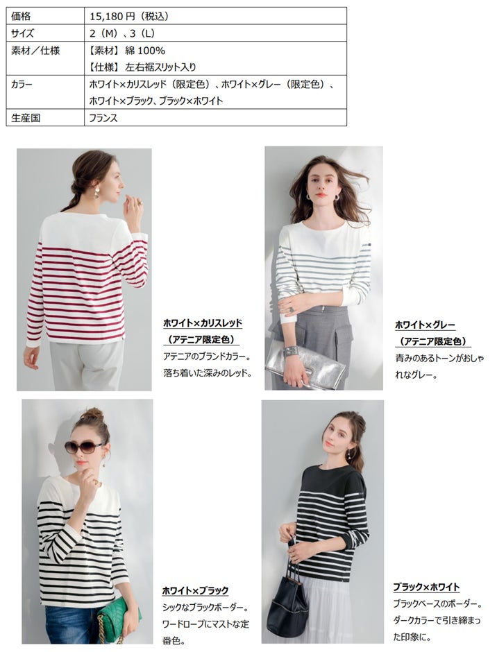 『ルミノア 洗練ボーダーカットソー』〈15,180円(税込)〉を、アテニアだけの限定色2色、定番色2色でお届けします。