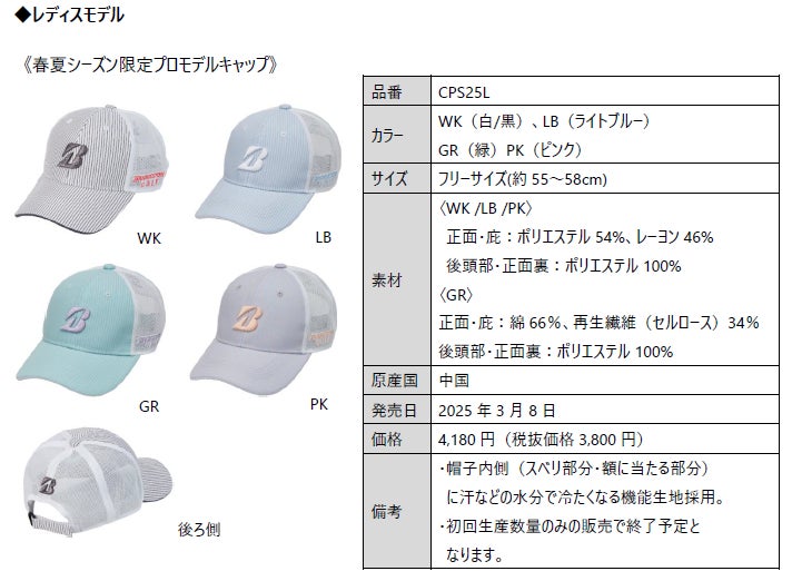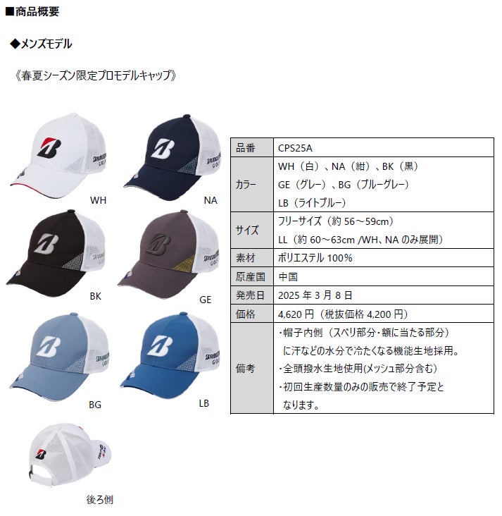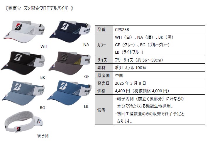 ブリヂストンスポーツ株式会社は、契約プロがツアーで着用するキャップ・バイザーのプロモデルシリーズから、春夏シーズン向けの商品を3月8日に発売します。価格は下記商品概要に記載の通りです。