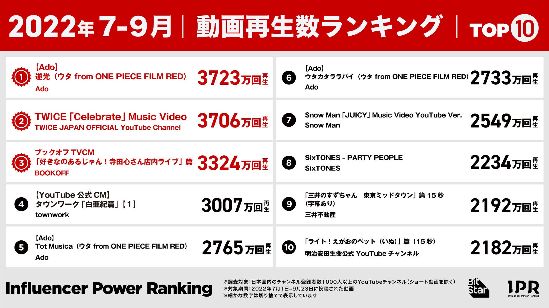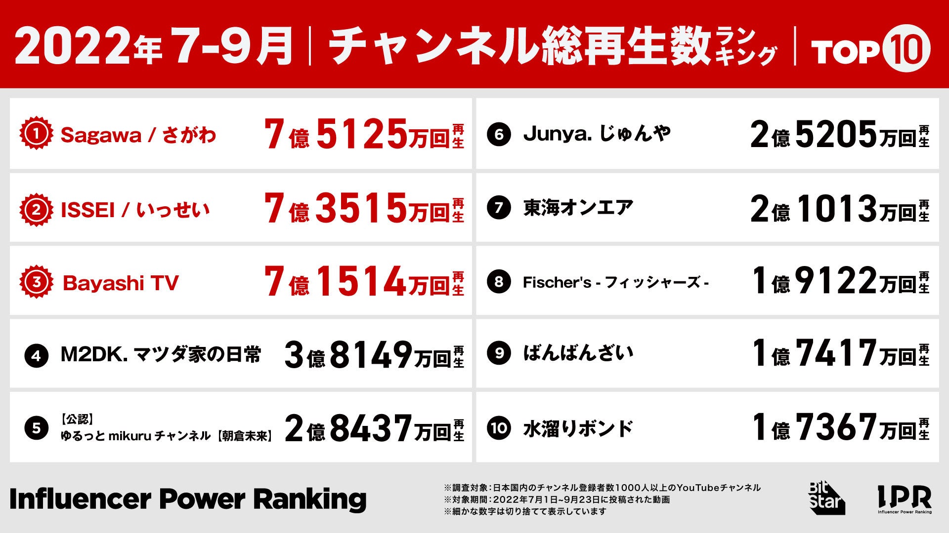 YouTubeやTikTokをはじめとするクリエイター支援事業・コンテンツ制作事業を展開する株式会社BitStar(本社:東京都渋谷区、代表取締役 社長執行役員CEO:渡邉拓、以下BitStar)は、独自の分析ツール「IPR(インフルエンサーパワーランキング)」のデータに基づき、2022年7-9月に活躍した動画クリエイターや動画チャンネルのランキングを発表いたします。