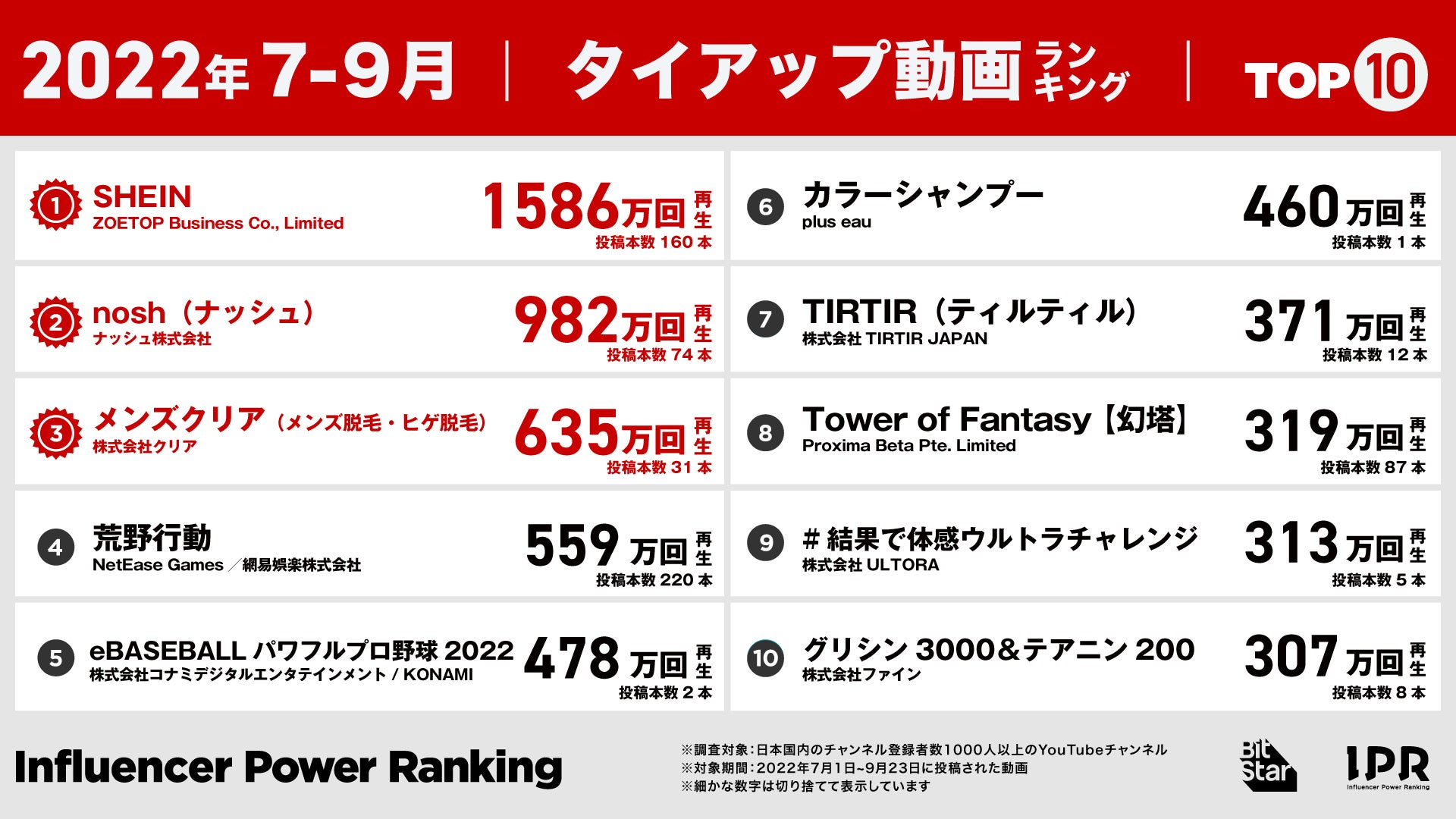 2022年7月1日-9月23日に投稿されたタイアップ動画(広告コンテンツ)で、同期間に多く再生されたランキングです。