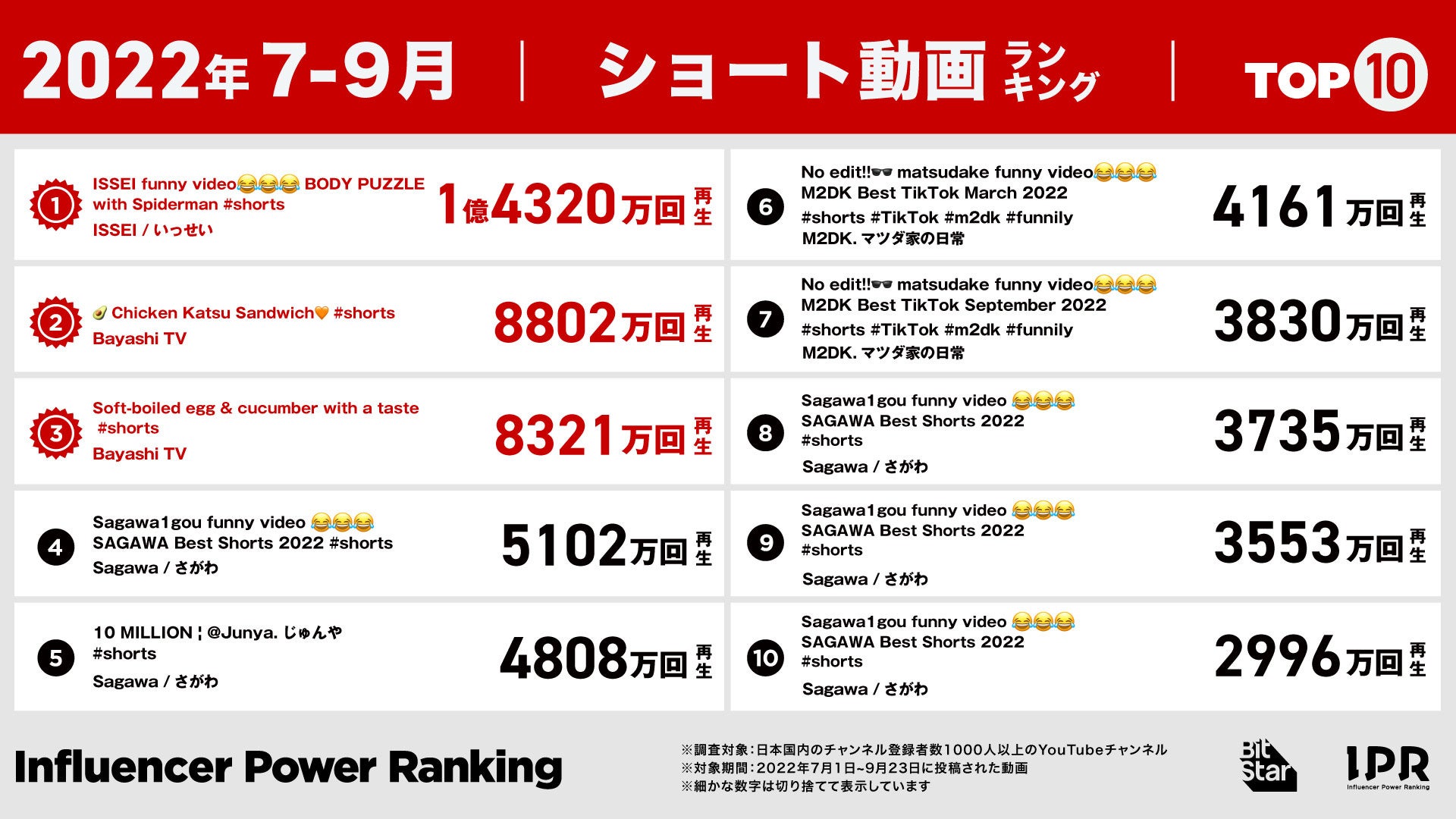 1分以内のショート動画「YouTube Shorts」の再生数ランキング。2022年7月1日-9月23日に投稿されたショート動画で、同期間に多く再生されたランキングです。
