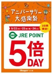 2022年9月22日(木)~9月24 日(土)の3日間、シャポー本八幡限定でJRE POINT5倍デーを実施いたします。 ぜひこの機会にシャポー本八幡にご来店ください。