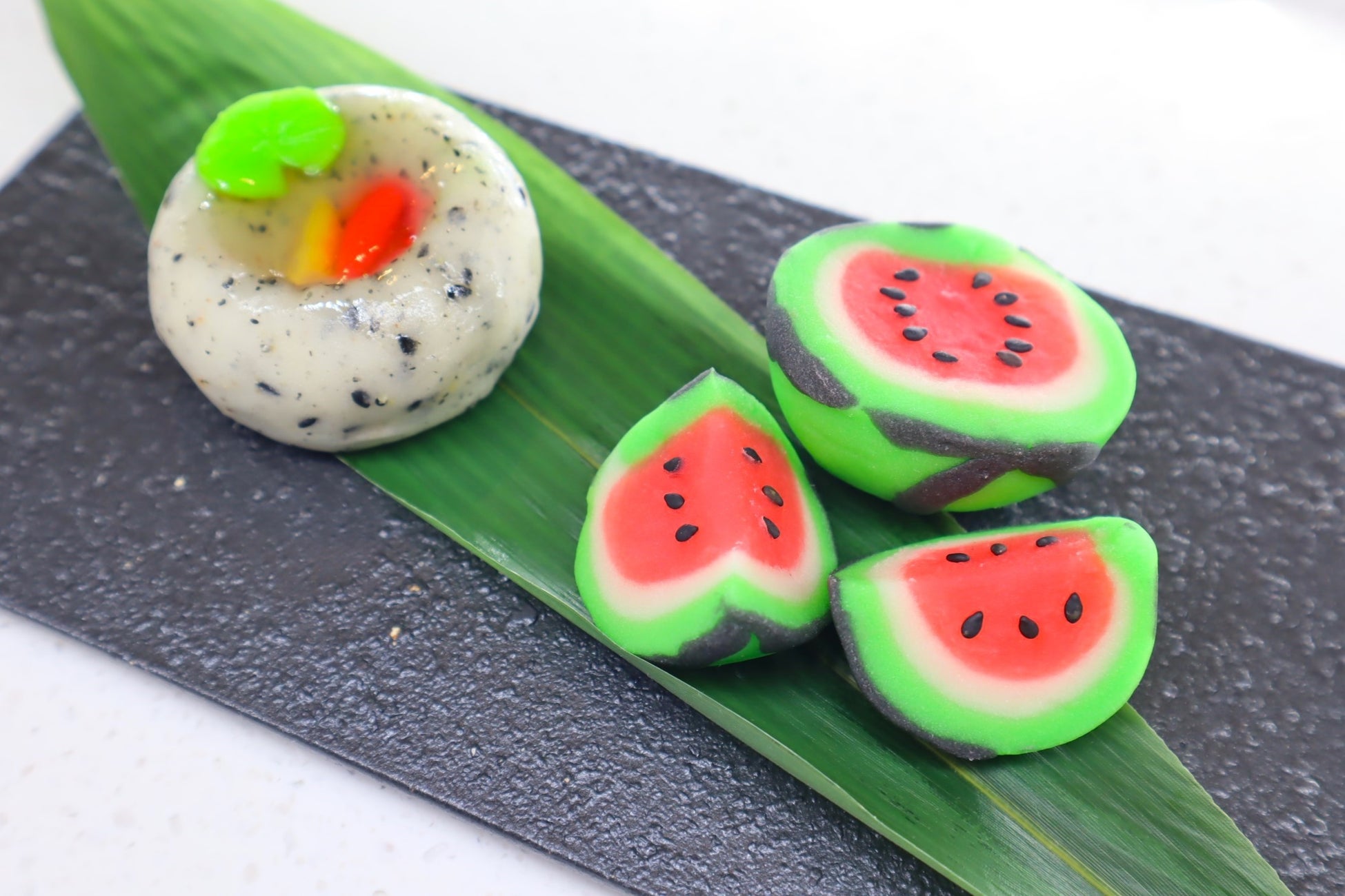 イベントでは、「金魚鉢」「スイカ」をイメージした夏らしい2種類の和菓子を作ります。「金魚鉢」は、白餡とつなぎを練り合わせた「練り切り」と煮溶かした寒天に砂糖などを加えた「錦玉羹」を使い、水に泳ぐ金魚を表現します。「スイカ」は、菓子匠 平安堂が開発した道具や手順書がセットになった「DIY手作り和菓子キット」の上生菓子を使用し製作します。小学校低学年以下の小さいお子様でも大人の方とご一緒に楽しく参加でき、当日製作した和菓子はお持ち帰りいただけます。