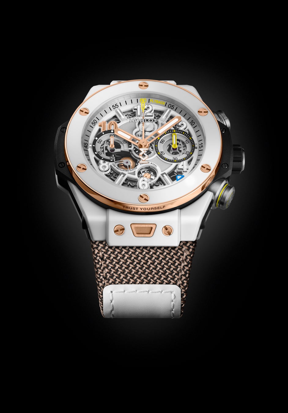 ケースはポリッシュ仕上げの18Kキングゴールドとマイクロブラスト加工のホワイトセラミックを組み合わせています。ホワイトは明晰さを、キングゴールドは挑戦心を象徴します。スケルトンダイアルはマットなアンスラサイトのルテニウムプレート仕上げにホワイトのアクセントが施され、シャープでテクニカルな印象を持つ現代的なクロノグラフデザインを実現しています。ストラップは交換可能な2種類の「ワンクリック」ストラップを採用。キングゴールドカラーのファブリック製ベルクロストラップと、KMロゴをあしらったブラック&ホワイトのラバーストラップから選択できます。サファイアクリスタル製のケースバックから、ダイアル側にコラムホイールを備え、約72時間のパワーリザーブを 実現する自社開発・製造のフライバッククロノグラフムーブメント「ウニコ」(キャリバーHUB1280)の精巧な動きを楽しめます。「ウニコ」ムーブメントが主役となり、コラムホイール、振動クラッチ、フライバック機構がこれまで以上に明確に視認できるようになりました。イエローとキングゴールド