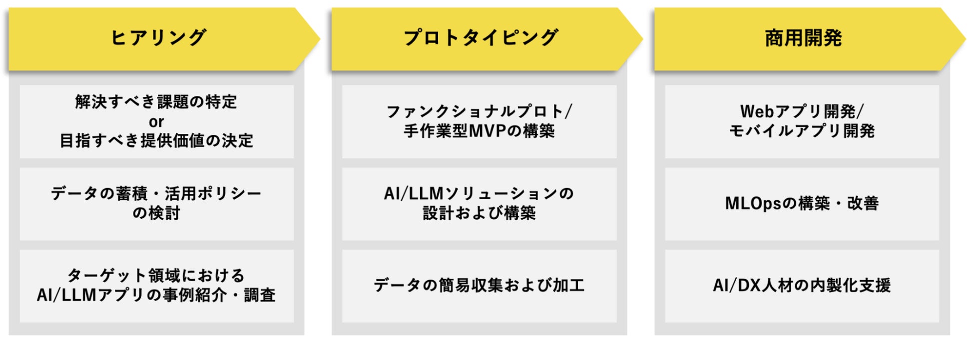 内容:「AI Transformation Studio」は、課題ヒアリング、プロトタイピング、商用開発の各フェーズを通じて、企業によるAI/LLMプロダクトの構築を支援します。これにより、企業はAI技術を活用して競争力を強化し、新たなビジネスの創出や大幅なコスト削減が可能です。