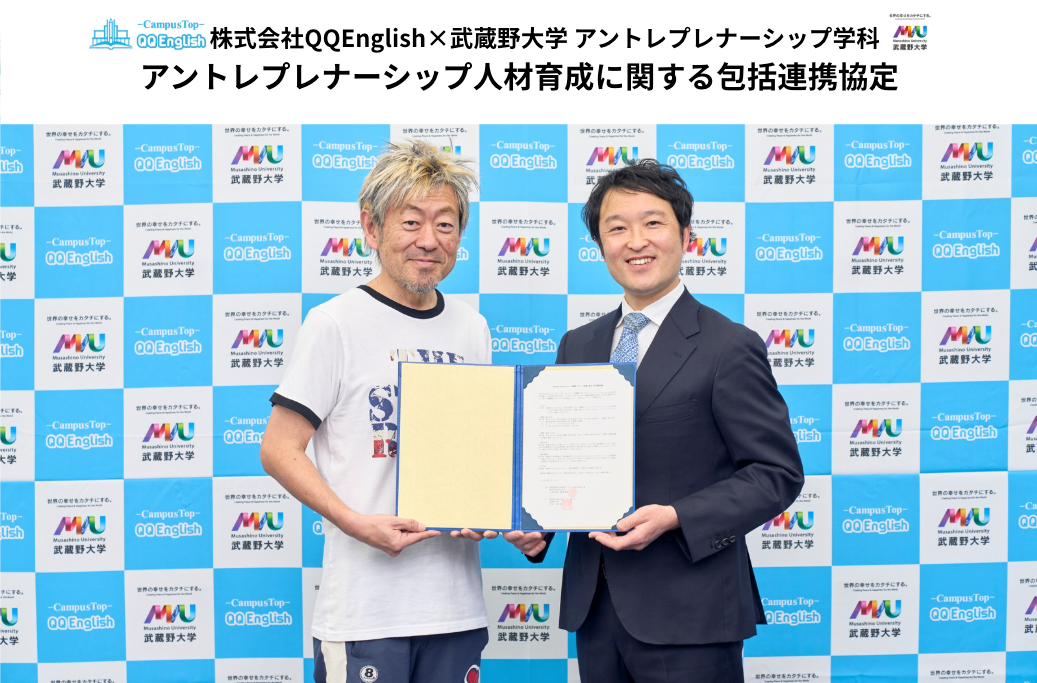 株式会社QQ English(本社:東京都新宿区、代表取締役:藤岡頼光、以下QQEnglish)は、武蔵野大学 アントレプレナーシップ学科(所在地:東京都西東京市、学部長:伊藤羊一、以下「EMC」)と包括連携協定を締結しました。
