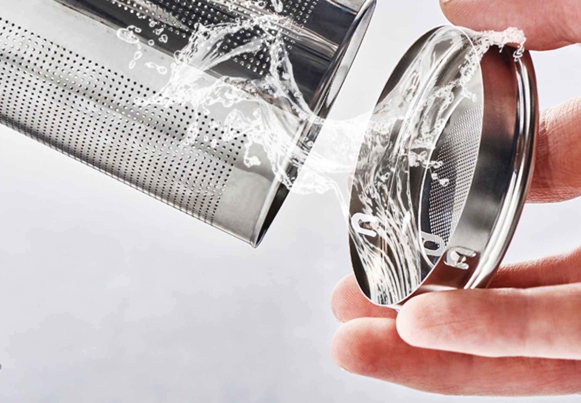 本体は割れにくい耐熱強化ガラス(耐熱温度170℃)だから湯量が一目で確認できます。ティーポットとして使用したあと、におい移りがしにくいのもガラス製の嬉しいポイント。使った後のお手入れは、付属の“茶こし”の底を外すことができるので、すみずみまで清潔に保つことができます。