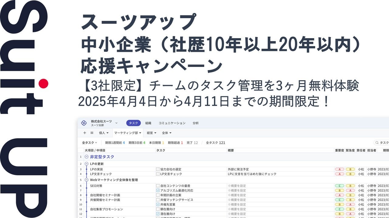 株式会社スーツ(所在地:東京都千代田区、代表取締役社長CEO:小松 裕介)は、チームのタスク管理・プロジェクト管理ツール「スーツアップ」において、中小企業(社歴10年以上20年以内)応援キャンペーンを実施いたします。