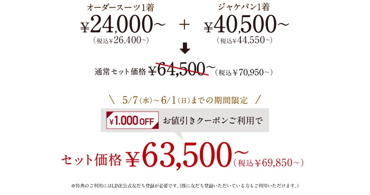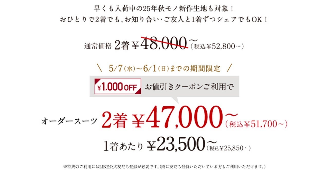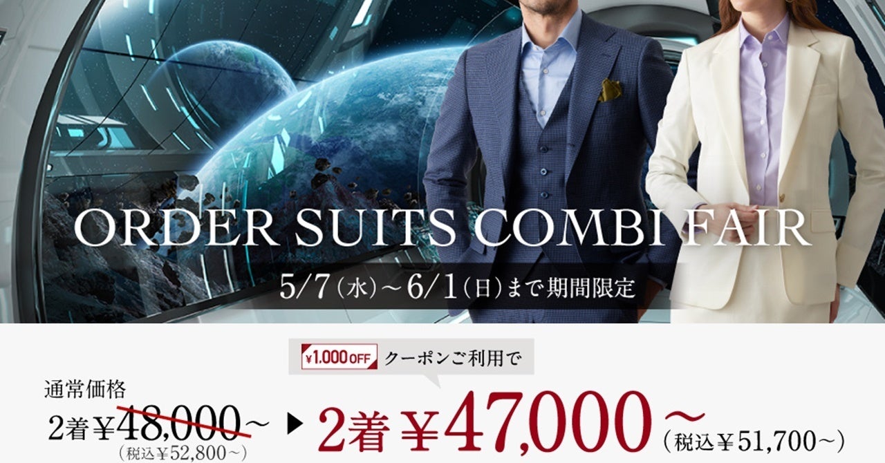 オーダースーツ専門店「GINZAグローバルスタイル」が、5/7~6/1の期間限定でお得なフェアを開催!クーポンご利用で本格オーダースーツ2着¥47,000~(税込¥51,700~)