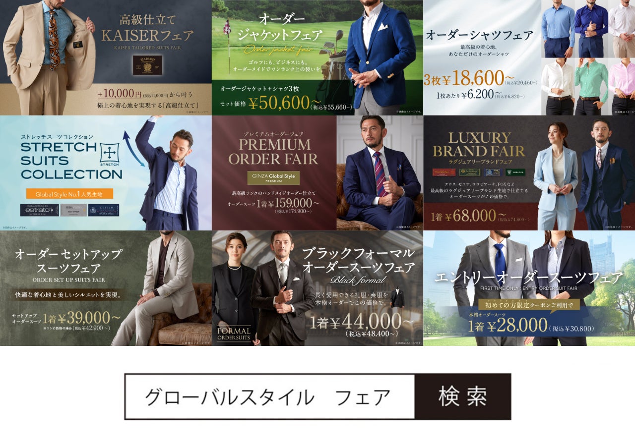 オーダースーツ専門店「グローバルスタイル」を運営するグローバルスタイル株式会社(東京証券取引所 スタンダード市場:7126、本社:大阪市中央区、代表取締役社長 田城弘志)は、対象プランのご利用で、本格オーダースーツ1,000円OFFクーポンをプレゼントするフェアを開催いたします。フェアは5月7日(水)から6月1日(日)までの期間限定、全店舗対象です。