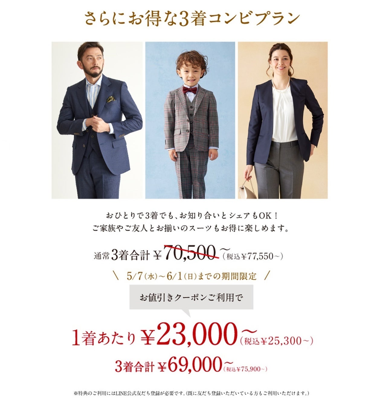 ※コンビプランとは・・・オーダースーツ2着以上ご購入していただいた場合の1着あたりのお値段です。組み合わせは自由ですので、異なる価格帯のオーダースーツと組み合わせていただいても本価格が適用されます。