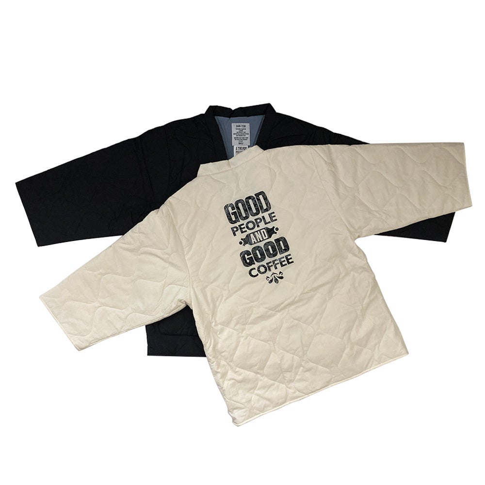 中綿には再生ポリエステルを使用し、従来のはんてんの厚みを解消。袖や身頃のデザインをすっきりとさせることで、今っぽい適度なゆとりのあるシルエットに。リラックスできるゆるさと、家事や作業時の動きやすさ。どちらもかなえる羽織です。