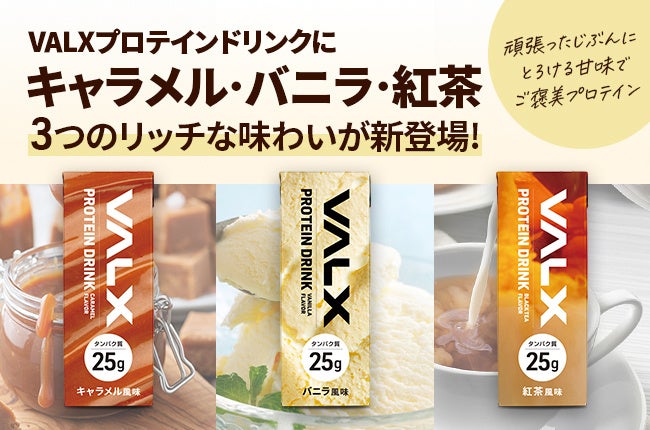 今回新登場したフレーバーは、とろけるような甘味のキャラメル風味と濃厚な甘さのバニラ風味、香り豊かな紅茶風味からなり、まるでご褒美のようなプロテインに仕上がりました。