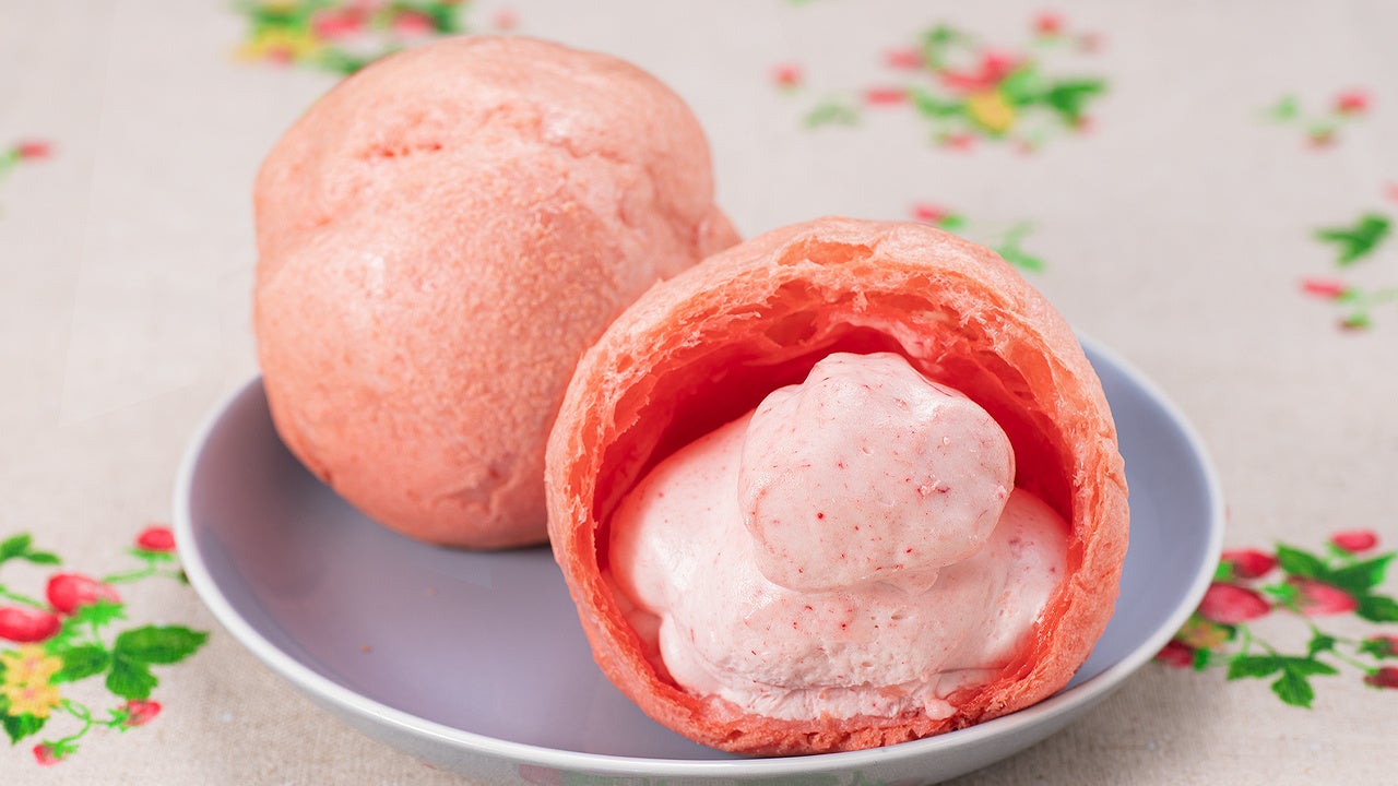 もっちり食感のいちご色の皮に、苺の爽やかな酸味を感じられる甘酸っぱいクリームをいれました。